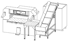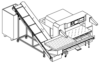 Abtransport von Schneidabfällen leicht gemacht mit dem neuen Platz sparenden Späneförderband SF-PT. Zur Platzierung des Förderbandes wurde ein verbreiteter Lufttisch 125x75cm installiert, an dessen Vorderkante ein leicht erhöhter Trichter montiert ist. Der Abfall wird in den Trichter eingeworfen und fällt in den darunter liegenden Auffangkorb des Förderbandes. Das Förderband wird in zwei Förderhöhen geliefert und kann links oder rechts der Schneidemaschine aufgestellt werden.