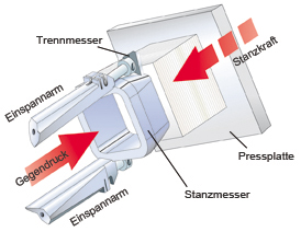 Das Stanzmesser wird speziell für Gegendruckstanzung gefertigt, mit einer innen im Messer beweglichen Kunststoff- oder Aluminiummatrize. Die jeweilige Anlage ist an ein Druckluftsystem anzuschließen. Das Stanzgut wird vor der Matrize eingelegt und während des hydraulischen Stanzdruckes zur Stabilisierung senkrecht im Messer gehalten. Nach Vollendung des Stanzhubs stößt der pneumatisch betriebene Gegendruckzylinder das gestanzte Material zurück in den Einlagewinkel der Stanze, aus dem es entnommen wird. Die Leistung der Stanzmaschine reduziert sich hierdurch um etwa die Hälfte.